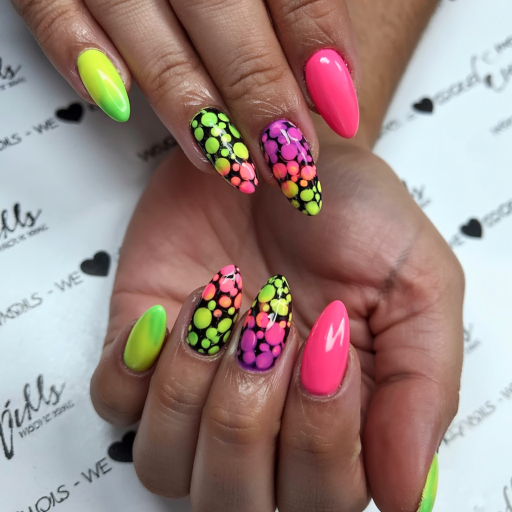 Electric acid-bright almond nails are an unbeatable way to convey fun, funky style. The high-gloss finish alternates neon solids with textured polka dots for an edgy and energetic aesthetic. The Y2K revival style is manifested in these nails, which have a modern appeal for festival celebrations or rooftop parties. The mix of hot pink, neon green and bright yellow is perfect for 2025’s love of bold experimentation.