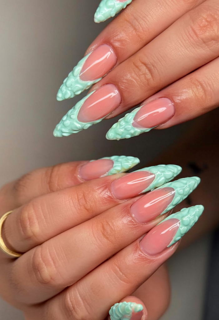 The design takes a fresh approach to the basic French Tip concept through mint green textured patterns on a nude base. Each textured bubble creates complex dimensions while introducing an avant-garde texture that makes the design uniquely funky and modern. косметологам-трендсетерам этот дизайн представляет необходимый эксперимент. The look of these nails will be best accentuated when worn with white outfits or solid colors with a minimalist design.