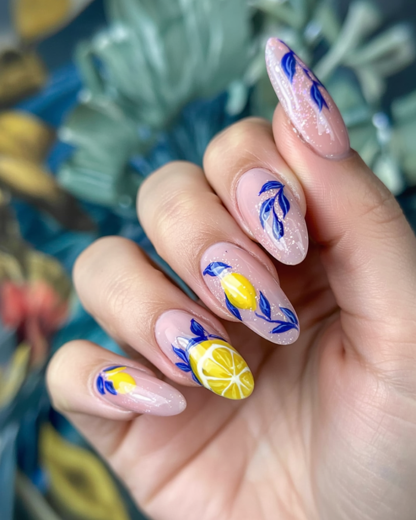 A lemon-themed artwork featuring organic elements alongside natural vines and blue leaves occupies the space between 4396 and 4745 of the document. The combination of leafy blue vines and citrus fruits on a glittery clear base provides an elegant and whimsical presentation suitable for elegant brunches or garden events. This set successfully blends artistic elements with practical wearability in keeping with the fashion outlook of 2025.