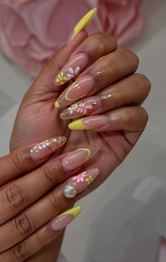 The 8th set features an elegant floral design with pale yellow that blends harmoniously with pink. Striking designs emerge from transparent pink bases, enhanced by detailed drawing work to create refined simplicity. They suit the style preferences of those who want to maintain their natural nails, but want preventative yet fashionable designs.