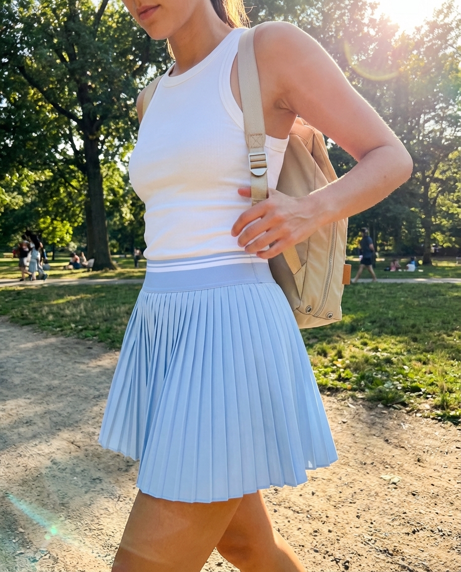 That $38.99 pleated tennis skirt in sky blue, made from moisture-wicking polyester, held up for us after two hours sitting in the sun at a park picnic. Paired with a simple white ribbed $15 racer tank, this look embraces a preppy yet comfortable vibe for any casual summer outing. It’s hard to mess up a classic combination like this since the components are straightforward and functional. The cold wash, hang dry guideline ensures longevity for both the skirt and the true to size white women’s athleisure top. If you need something playful, fresh, and preppy, this works.