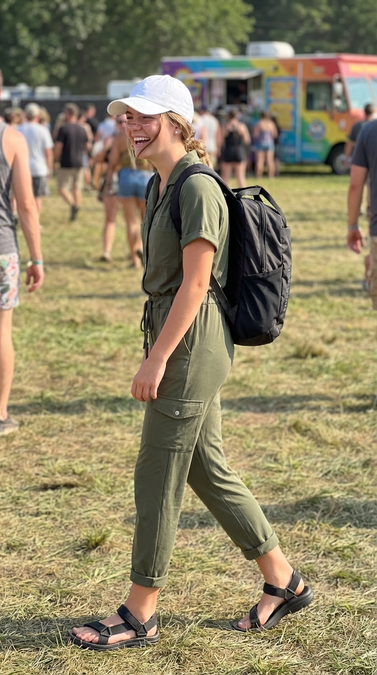 For more active camp days, this outfit combines practicality and style. The hero piece is an olive green cotton twill cargo jumpsuit from SexyModest Boutique ($75), featuring a functional drawstring waist and roomy pockets. Following the stylist’s note, the sleeves and pant legs are rolled up for a relaxed, summery feel perfectly suited to a nature walk or workshop. The look includes a white cotton baseball cap ($19) for sun protection, black EVA foam sport sandals ($35) for grip, and a black recycled nylon backpack ($95).