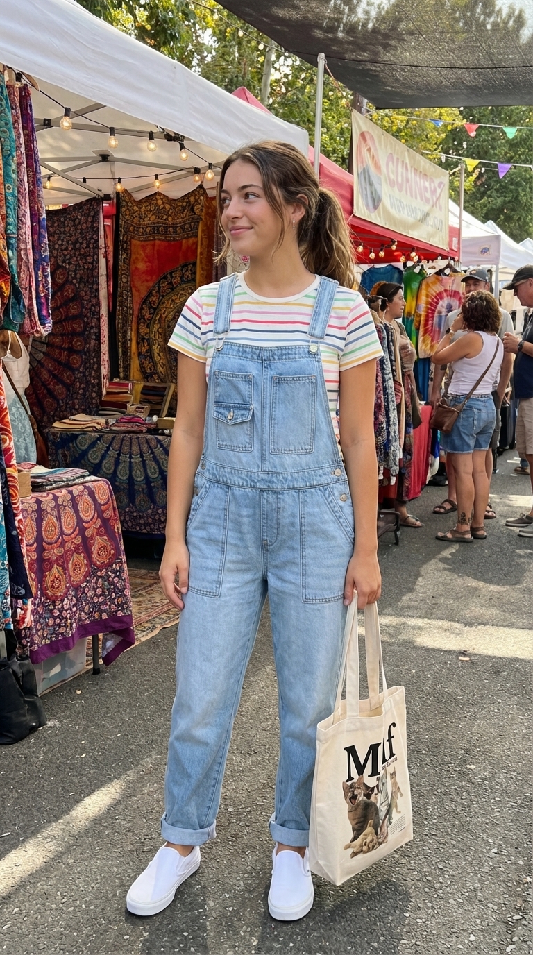 This outfit perfectly captures a comfortable and creative mood, offering a timeless look that feels both aspirational and easy to replicate. The combination of denim, stripes, and bright accents is a Pinterest-ready classic. For an effortlessly cool vibe, wear one overall strap unhooked and roll the cuffs slightly to highlight the sneakers. A practical tip for the 100% cotton denim overalls is to wash them inside out in cold water to preserve the medium-wash color and minimize fading over time.