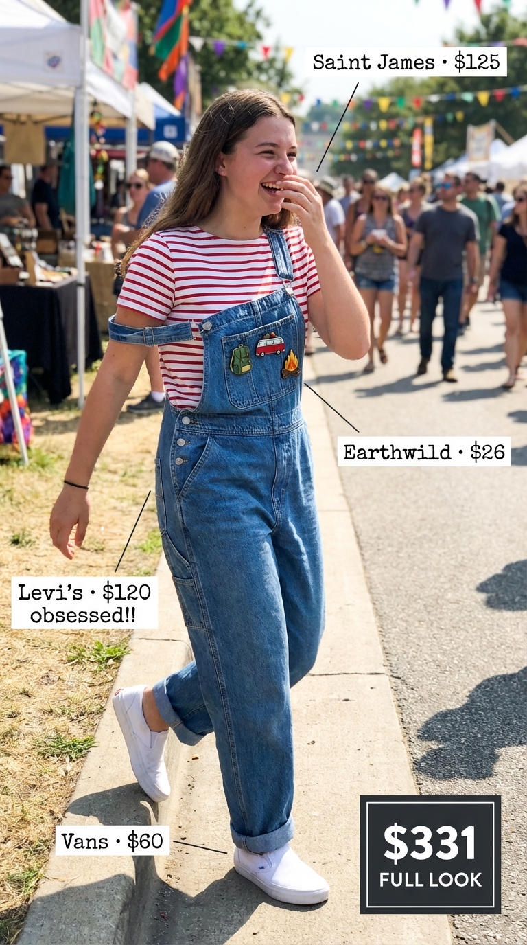 This whimsical outfit is built around a pair of Levi’s Full Length Baggy Overalls in a medium denim wash ($120), whose 100% cotton denim is durable enough for messy projects like pottery or gardening. The hero piece is layered over a classic cotton jersey top ($125) featuring cheerful red and white Breton stripes. The look includes simple white canvas slip-on shoes ($60) that are easy to kick off and simple to clean if they get splattered. For a final personalized touch, a trio of enamel pins ($26) adds character to the overall bib, tying together the creative, camp-inspired aesthetic.