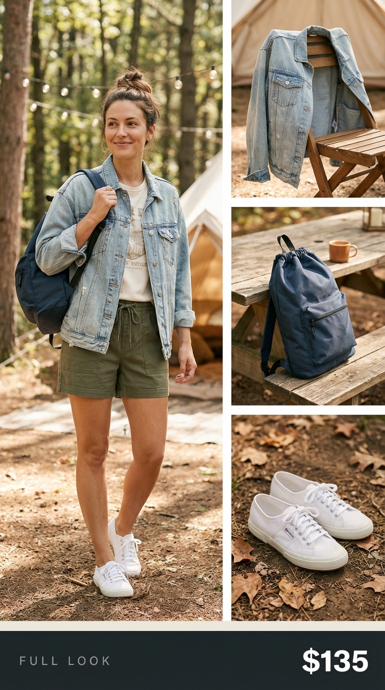 This layered campfire look is centered around a truly versatile piece. The hero is an oversized cotton denim jacket from Peppermayo ($44) in a classic blue wash, perfect for layering as temperatures drop. It’s paired with olive green stretch twill shorts ($25.89) with an adjustable waist for comfort. The outfit uses classic white canvas sneakers ($49) with reliable grip for camp surfaces and a lightweight navy nylon drawstring bag ($16.19).