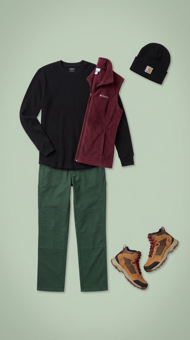 For a rugged adventure, this stargazing outfit uses wardrobe essentials built for the outdoors. The core piece is a burgundy Columbia Sportswear fleece vest ($30), using a polyester blend for warmth without restricting arm movement. It layers over a black waffle knit shirt. The base is a pair of heavy-duty cotton canvas pants ($34.95) in forest green, and the look is topped with a black acrylic knit accessory ($19.99) for warmth.