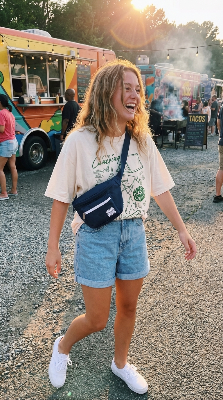 This outfit gets our vote for being both stylish and incredibly functional. The light wash denim shorts are a versatile summer staple, but the vibrant graphic tee is the true hero, adding a dose of youthful energy. The navy sneakers and black belt bag are smart, practical accents that enhance the sporty feel, making this an aspirational yet totally achievable look for any teen’s camp packing list.