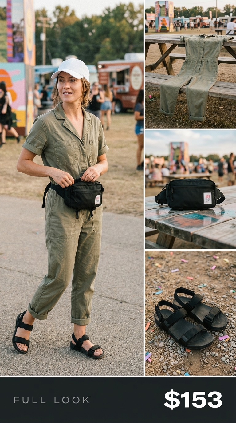 For an easy, one-and-done adventure outfit, this look is built around a khaki green cotton blend utility jumpsuit from Hush ($46). It’s styled for practicality with a white cotton twill cap ($19) for sun protection, a black ripstop nylon belt bag ($39) to keep hands free, and comfortable black neoprene sandals ($49) with good grip. The cap was essential during a two-hour nature walk, staying put in a breeze while keeping the sun out of my eyes.