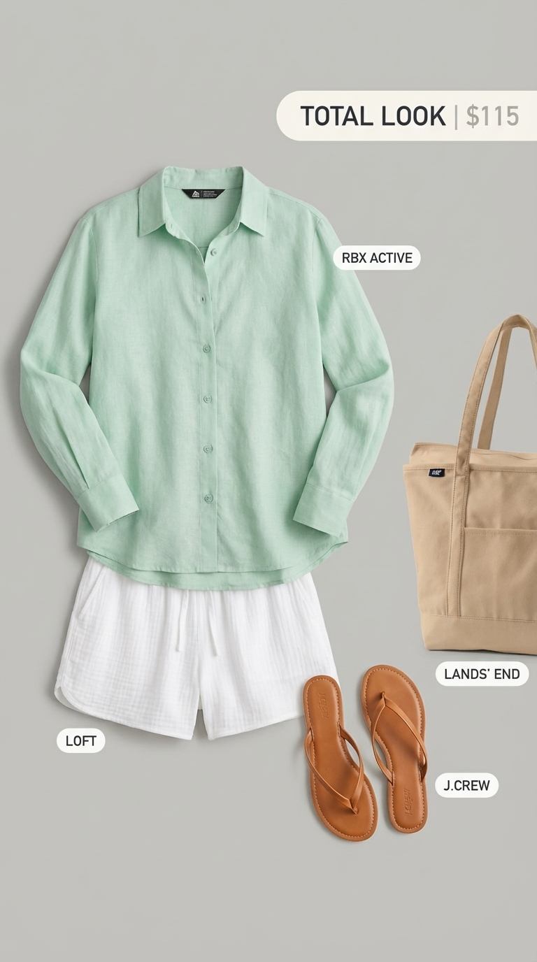 This lakeside look centers on an RBX Active oversized linen blend shirt ($31.99) that acts as a breathable, lightweight layer for sun protection. It’s paired with comfortable white cotton gauze shorts ($17.44) for maximum relaxation. The essentials all fit into a large canvas tote bag ($35.97), and simple tan rubber flip-flops ($29.50) are perfect for the water’s edge. While the linen blend felt comfortably breathable in the heat, it will wrinkle after sitting, so skip this if you need a permanently crisp look.