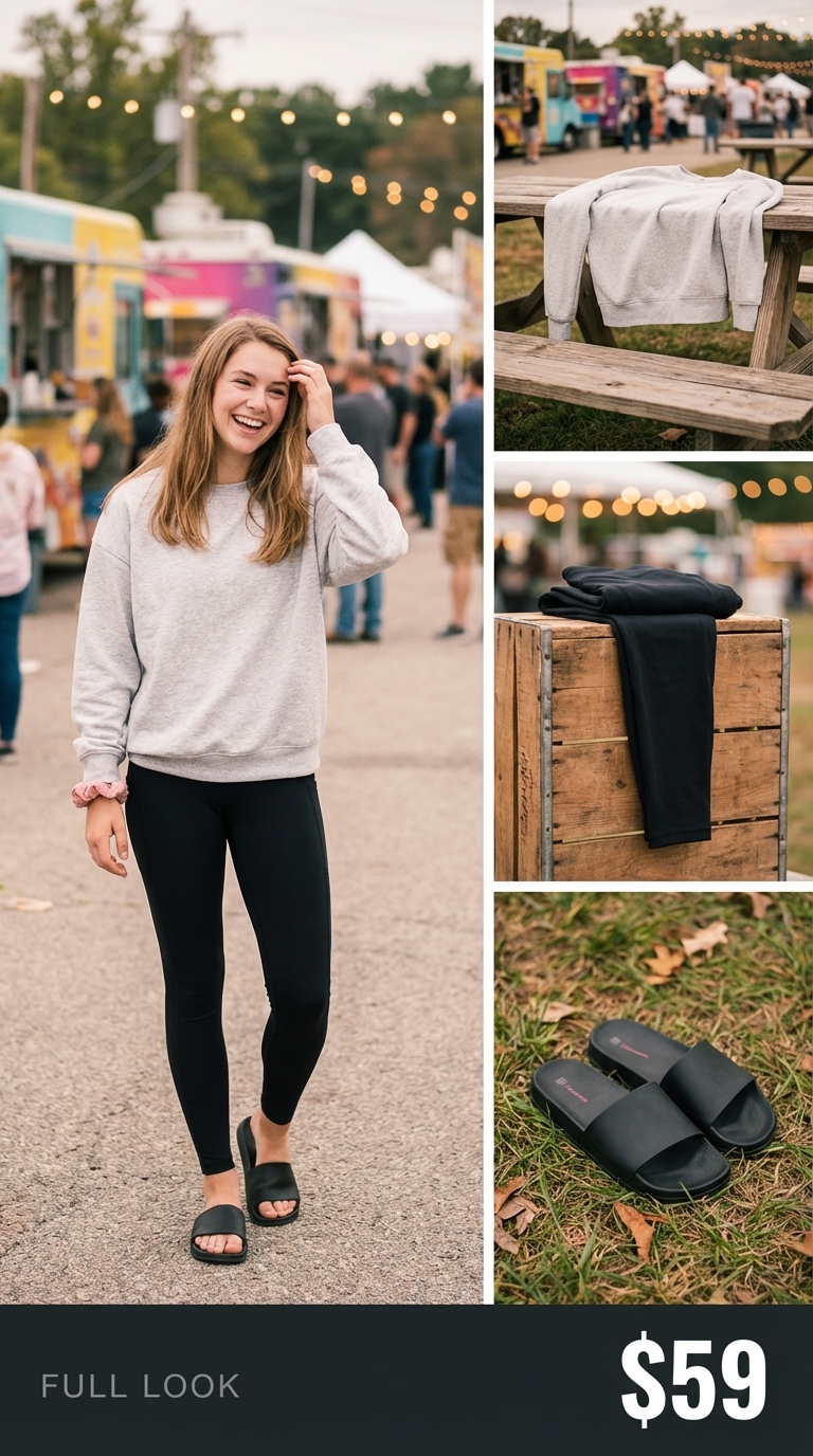 Achieve this cozy lakeside look for just $58.92. The outfit is centered around an oversized H&M French terry cotton sweatshirt ($24.99) in light grey marl, which is perfect for throwing on over a swimsuit on a cool evening. It’s paired with breathable, high-waisted black leggings made from a spandex blend ($15) and simple black EVA foam slide sandals ($14.98) for maximum comfort. A dusty rose cotton accessory, a swiss dot scrunchie, adds a subtle pop of color and keeps hair out of the way for $3.95.