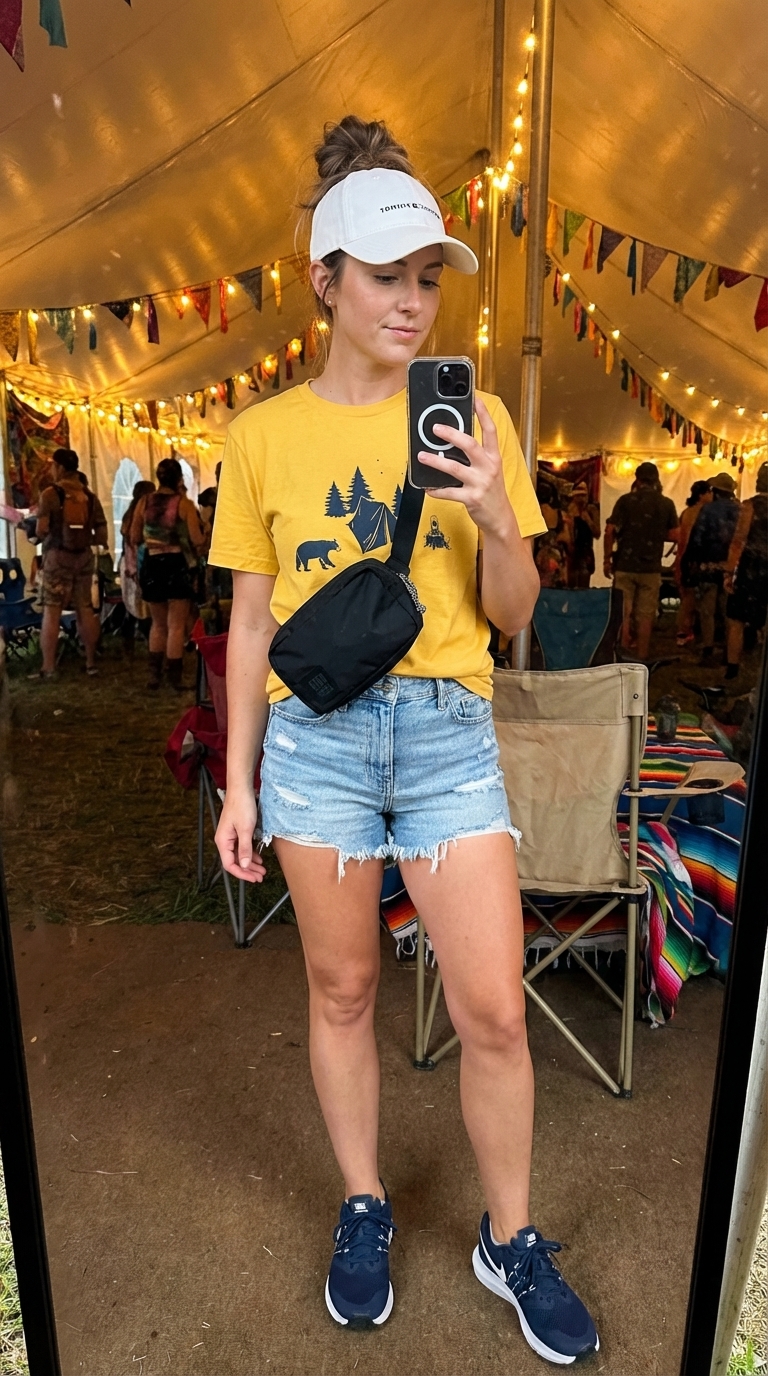 Surprisingly practical, this next look is built for a full day of fun. This outfit channels an energetic and playful vibe, perfect for lakeside adventures or active camp days. The combination of a bright yellow graphic tee tucked into classic denim shorts creates an instantly cool and casual base. A crossbody belt bag keeps your hands free for activities, while navy sneakers provide a sporty foundation and a simple white cap offers essential sun protection.
