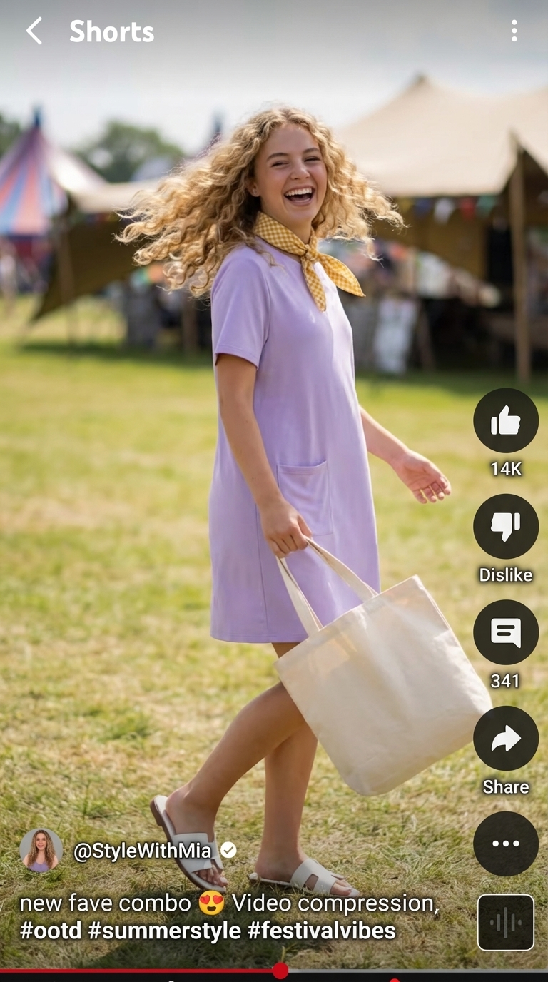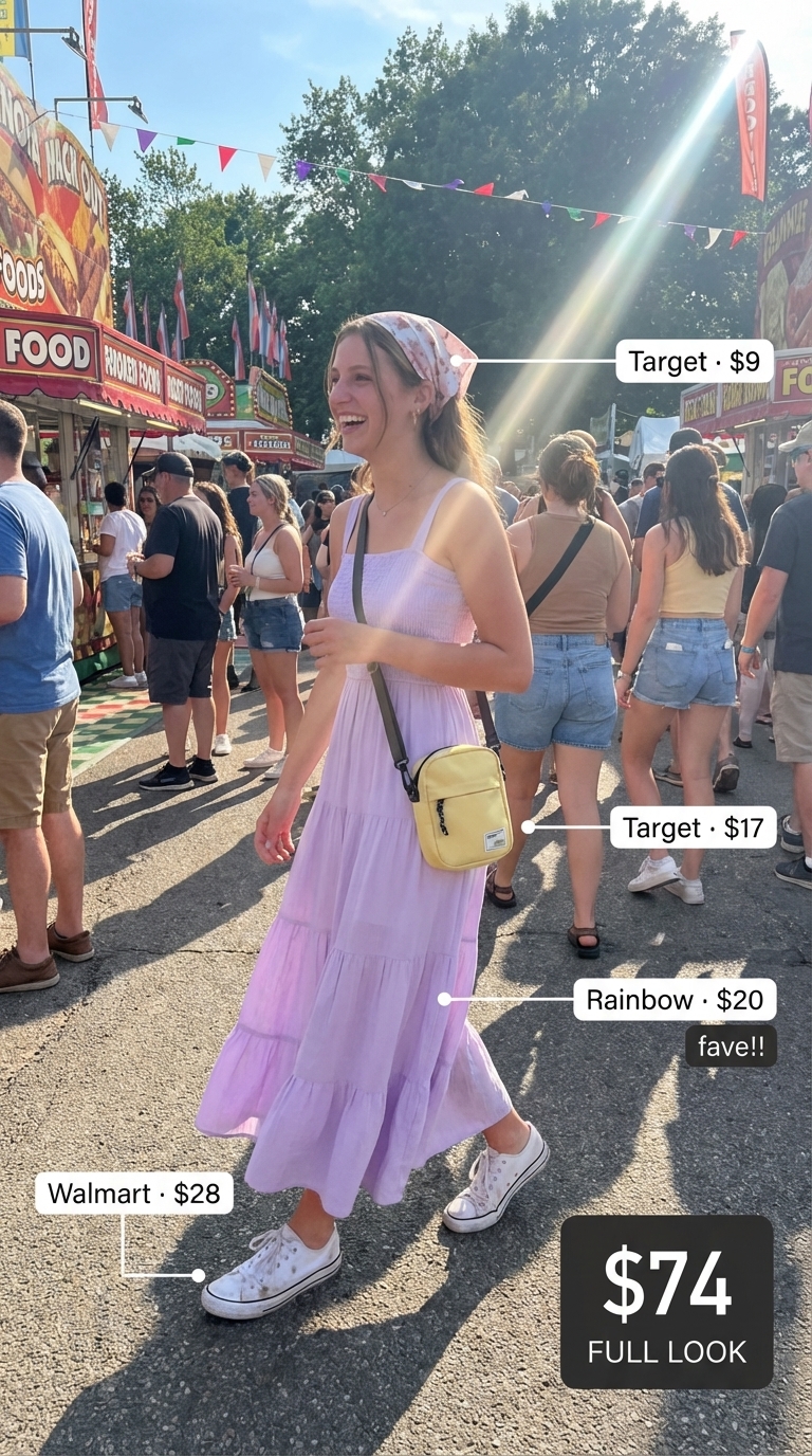 This outfit perfectly captures a youthful, casual vibe ideal for evening camp programs or meals. The soft lavender, white, and yellow palette is fresh and inviting. In our testing, the gingham cotton bandana stayed securely tied through an hour-long talent show performance, proving it’s a practical and playful accessory. The combination of a comfy dress and functional accessories creates a look that is both aspirational and easily achieved for everyday summer wear.