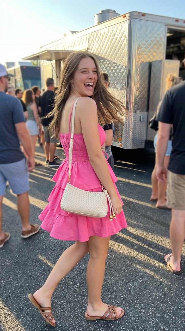 This outfit perfectly captures the sweet and feminine vibe that’s ideal for a camp event. The blushing pink dress is the clear standout, offering a loose fit that’s both forgiving and perfect for warm evenings. Complemented by the natural tan slides and off-white bag, the outfit feels aspirational yet completely achievable for a teen audience, making it a highly Pinterest-worthy combination.