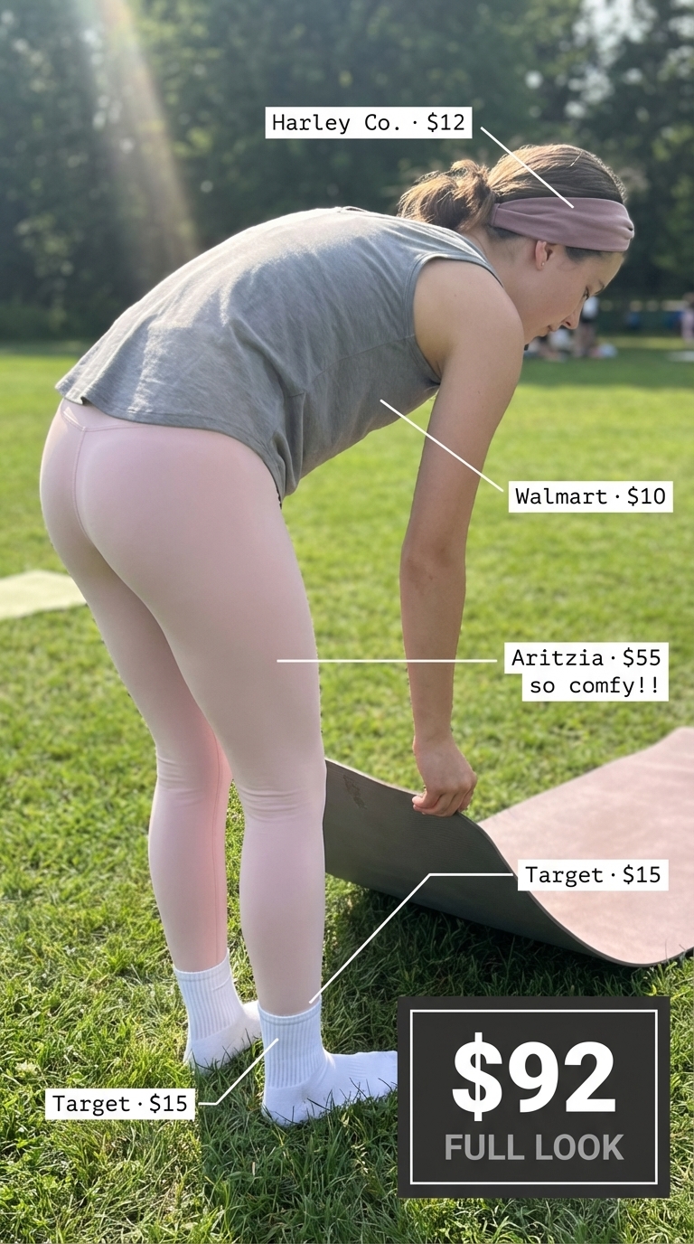 After a night of dancing, this serene yoga outfit fosters a sense of calm. The look is grounded by seamless dusty rose leggings ($54.60) made from a flexible nylon-spandex blend that moves with you. It’s styled with a loose-fitting light grey top in a soft modal blend ($10.18), a matching dusty rose cotton jersey headband ($12), and white yoga socks ($14.99). The entire four-piece ensemble comes in at just under $92, creating a harmonious and calming aesthetic perfect for morning stretches.