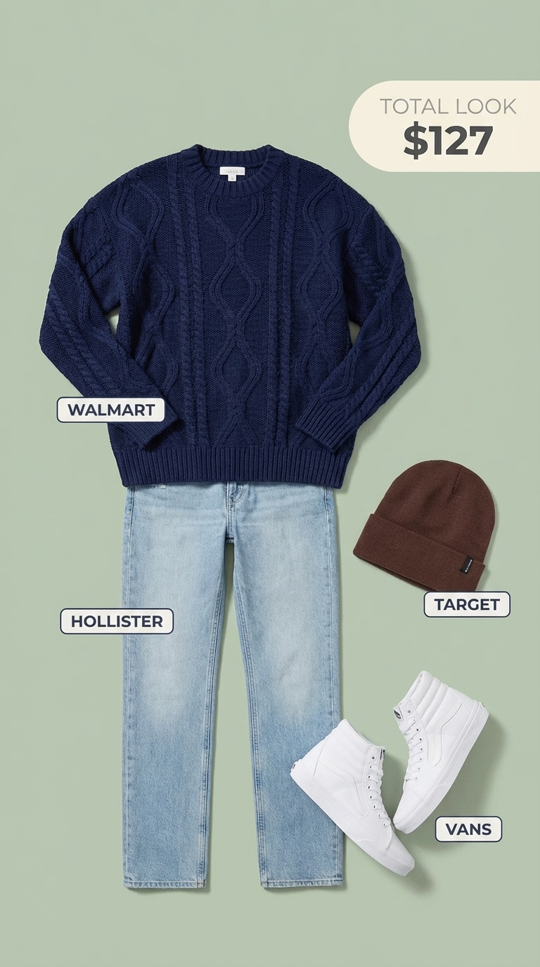 For cooler evenings, this stargazing outfit combines warmth and relaxed style. The hero piece is an oversized cable knit sweater from Walmart’s Fairy22 line ($27.49), essential for a chilly night. It’s paired with light wash denim bottoms ($19.99), canvas high-top shoes ($80) for ankle warmth, and a brown acrylic knit beanie ($12.10) for extra comfort.
