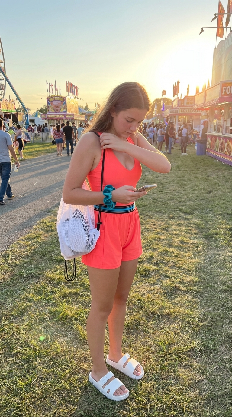 For days by the water, this playful outfit offers a stylish alternative to a traditional swimsuit. The hero is a bright coral swim romper ($128) made from a quick-dry spandex blend that provides extra coverage for active fun. Our testing confirmed it allows for effortless movement and dries quickly after a swim. It’s paired with easy, two-strap white EVA slide-on sandals ($29.99) and a white mesh drawstring bag ($12) that helps wet items air out. A vibrant teal scrunchie ($12) adds a final pop of color to the carefree look.