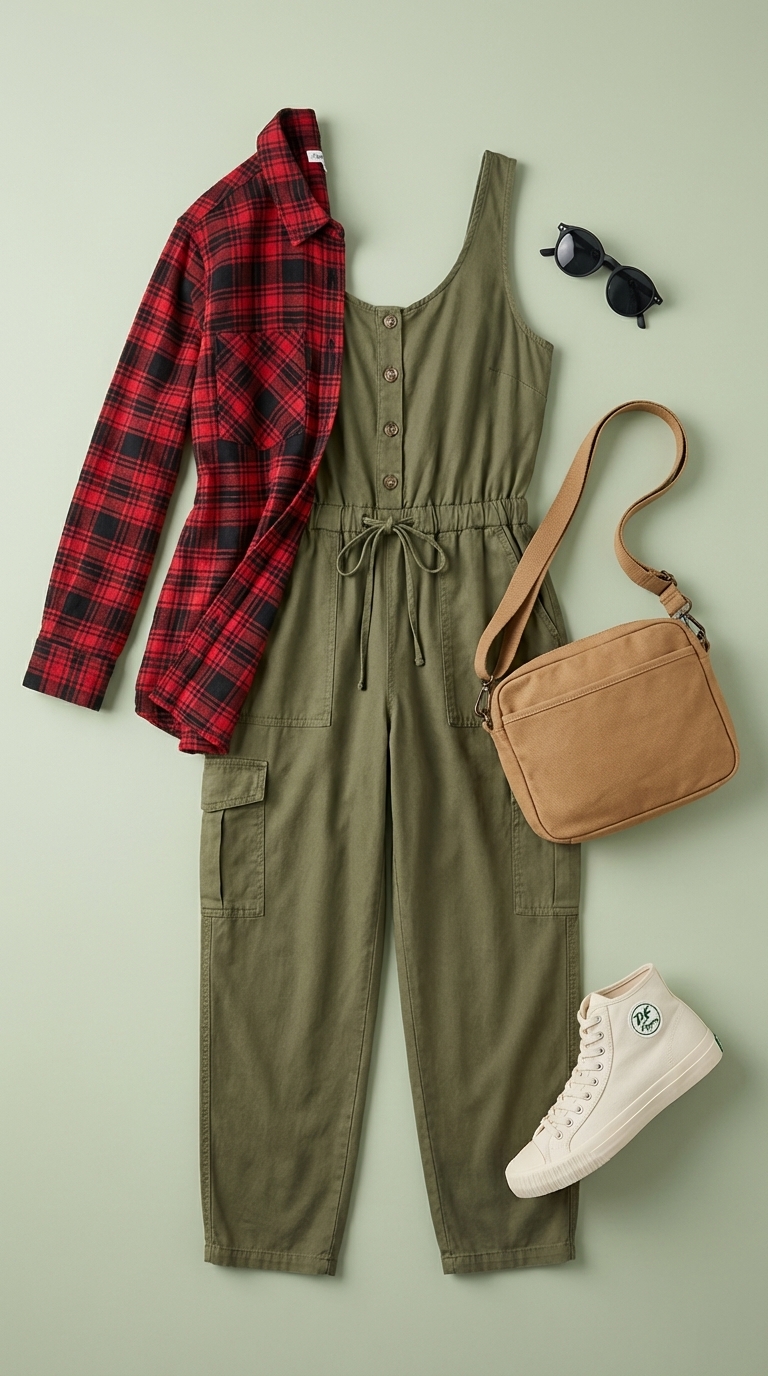 The SexyModest Boutique jumpsuit ($75) in durable cotton twill provides a utilitarian base for camp adventures. Layer it with a brushed cotton plaid top ($56.25) for a classic outdoorsy look and evening warmth. Sturdy canvas high-top sneakers ($70) offer all-day comfort, while the tan sling bag keeps essentials accessible, although its small capacity limits you to just the basics.