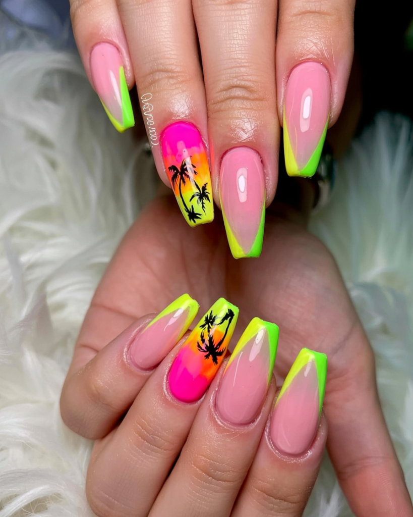 Bright green french tip nail designs combined with sunset palm artwork create a tropical vacation experience. The high-gloss pink and neon yellow gradients and palm tree illustrations are right out of a Miami boardwalk. These nails bring the Caribbean vacation vibe right into your living space.