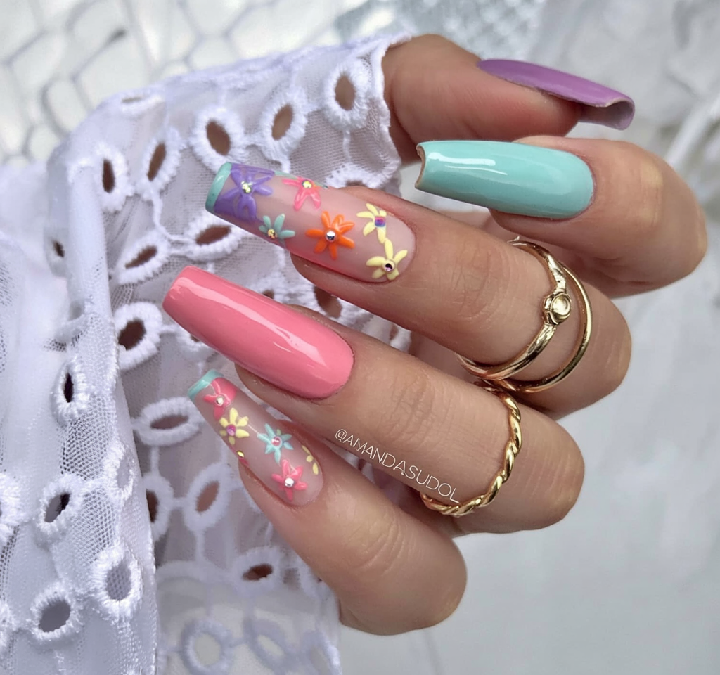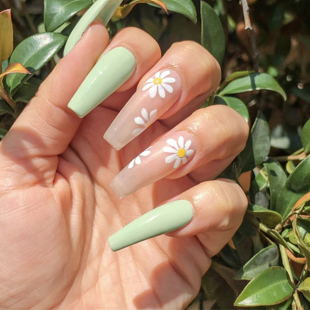 A beautiful botanical design blends natural elements with the nail trend through its sweet mix of colors. The nail design features hand-painted daisies between mint green and sheer nude shades to create a modern take on natural nails. Soft spring colors combined with floral motifs in this design transport viewers to happy outdoor gatherings under the sun. Women who prefer medium coffin nails combined with soft pastels and feminine touches will find the perfect match in these nails.