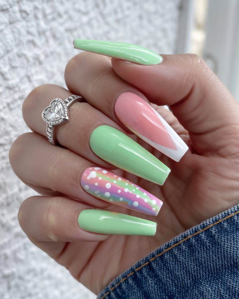 The mint green elements with polka dots and negative space create a playful lock in this look. The ring finger features a diagonal pink and white color block design, while another nail features rainbow design dots arranged in pastel stripes. Stamping coffins nails are perfect for women who want to try new designs while maintaining their clean look and modern appeal.