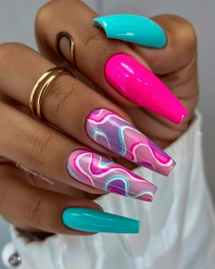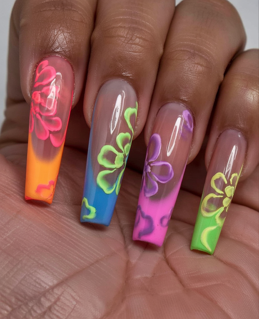 The manicure features cheerful floral elements that blend beautifully with neons to create a cheerful design. The bright nail polish images on each hand represent a different shade from orange to blue and pink to green before receiving clear nail polish and hand-drawn imperfect floral patterns. These long coffin nails showcase playful appeal through detailed nail art that blends summer charm. Ideal for festivals and tropical vacations, these nails are the perfect styling choice.