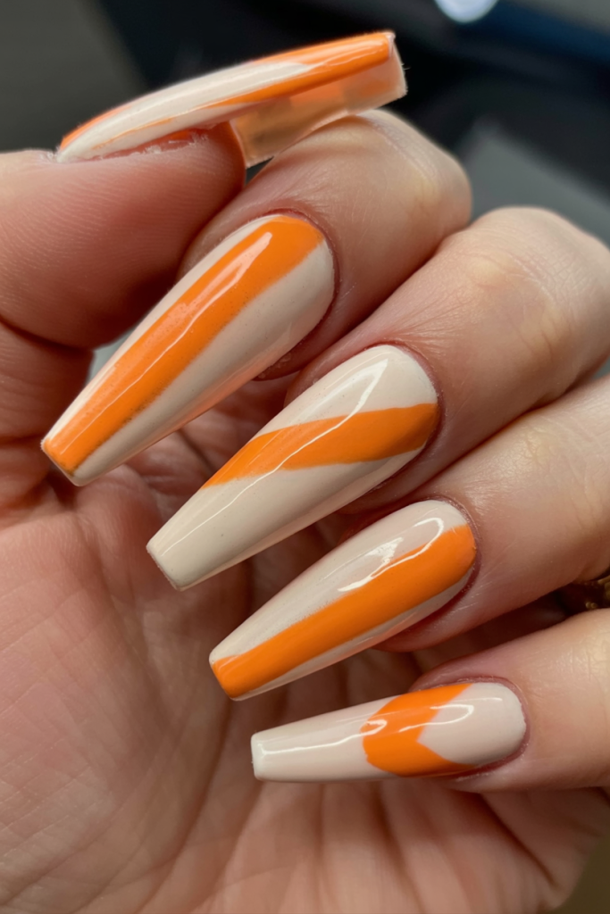 This minimalist mani has a unique style that will appeal to those who prefer simplicity. A clean cream polish serves as the base for stylish orange swirls that combine the style of sophistication with the feel of summer. This sophisticated color scheme provides an uninhibited impact while remaining understated, allowing summer enthusiasts to avoid over-emphasizing their appearance. A strong coffin shape enhancement completes the look and adds sophisticated style to everyday outfits.