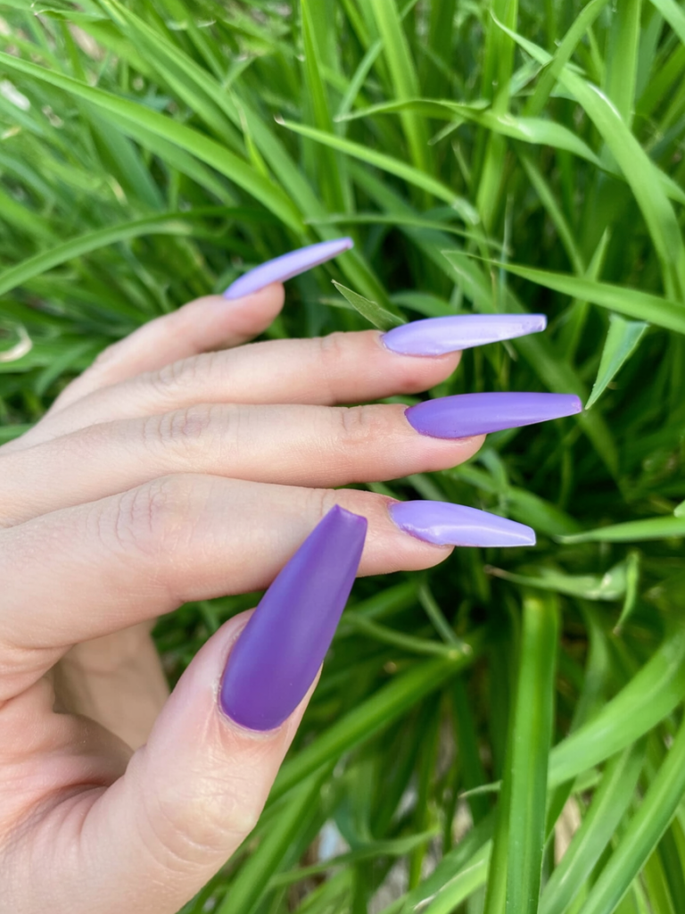 Matte lavender tones create a peaceful look that proves summer can remain sophisticated without the need for bright neon elements. The use of contrasting shades of purple between the nails adds depth to the look without being overpowering. The medium coffin nail shape and velvety smooth finish add a touch of class to this playful color scheme. Wear with maxi dresses and linen sets to achieve this seasonal ensemble for a look that is both sweet and sophisticated.