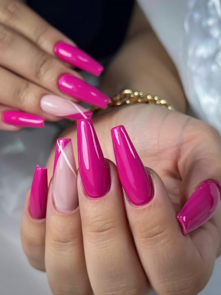 A high-gloss pink variation of a classic shade makes a bold statement in nail looks. Hot pink dominates most nails with an accent nail consisting of a subtle nude base and an elegant white abstract line. A simple acrylic nail design provides the interest factor that draws attention away from the dominant pink aesthetic. A simple yet powerful design that works perfectly with both vibrant summer dresses and shiny metallics.