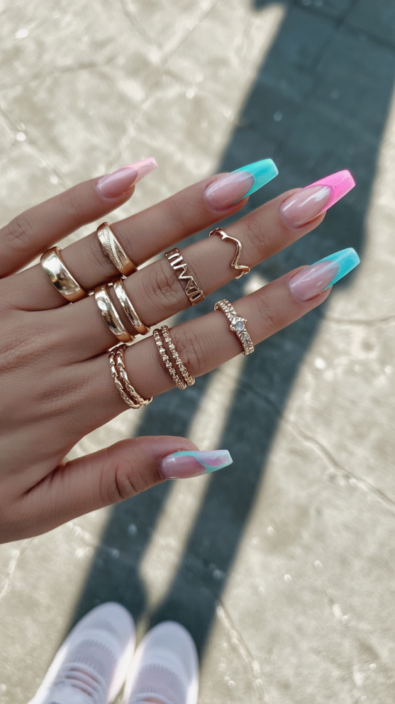 A manicure with this summer-autumn color spectrum is truly mesmerizing as it perfectly captures outdoor sunset scenes. Each fingernail features a soft French tip that transitions smoothly from pink to blue hues to create a sunset look. The gel nails receive a high-gloss coat that enhances the colors, while the long coffin shape provides a striking, dramatic look. Pair the nail design with minimal gold jewelry for a sophisticated yet colorful summer look.