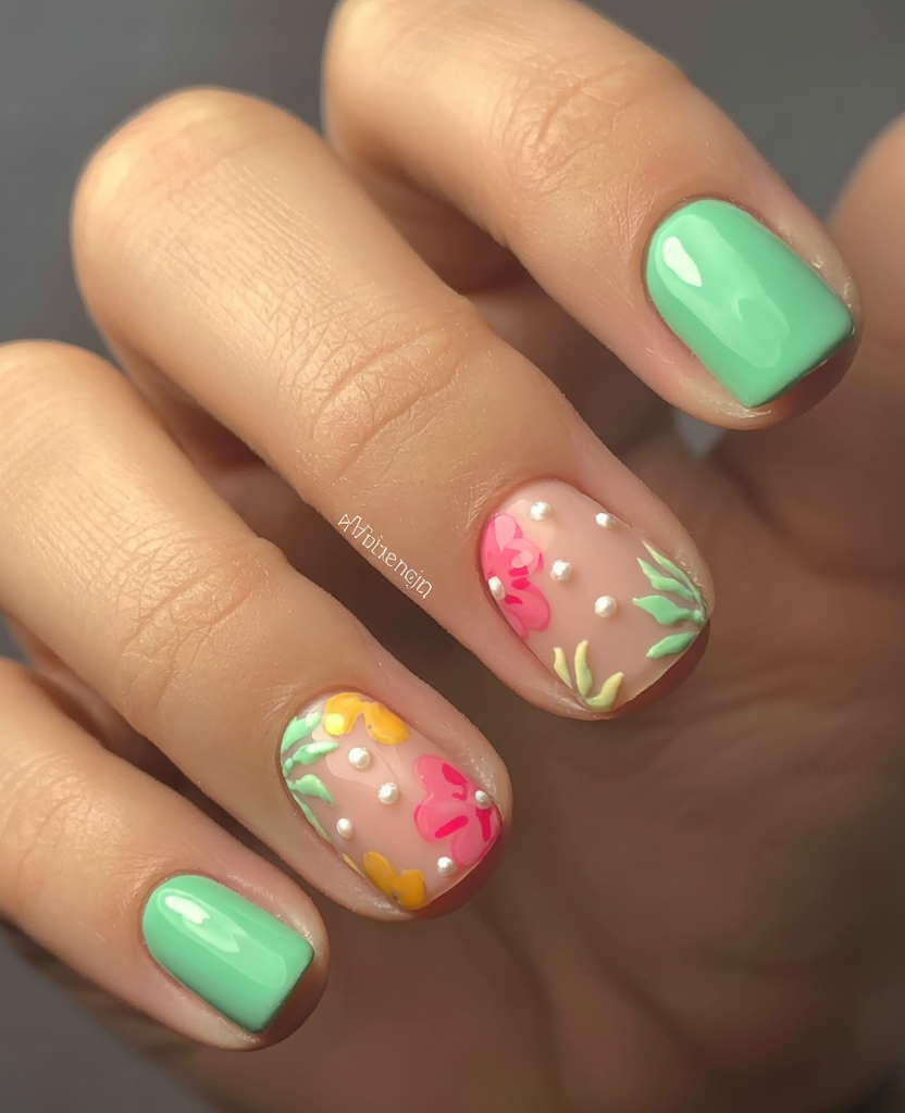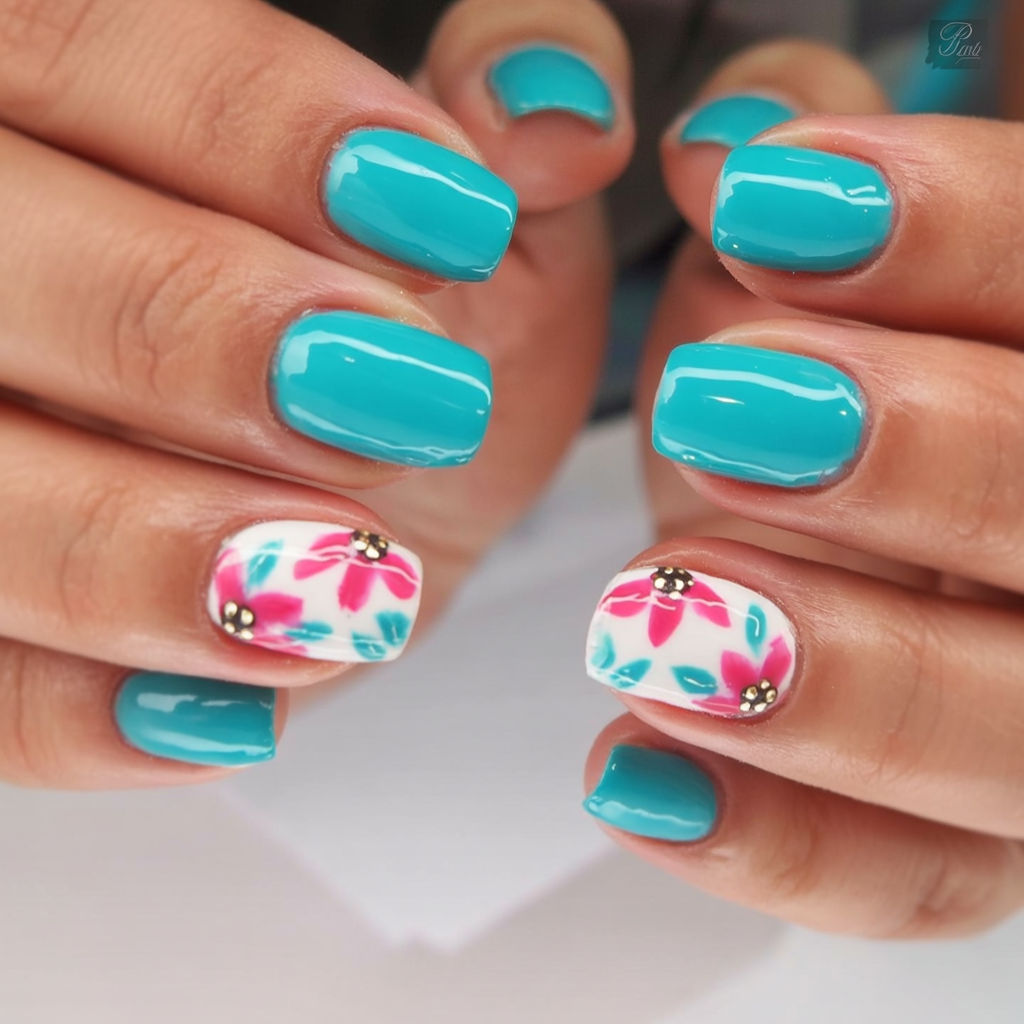 The friendly short nail collection expresses tropical vibes through its blue teal painted design with floral decorations. The two decorated nails feature colorful floral stickers and tiny gold studs. This design combines tropical vacation-inspired colors with round nails for everyday practicality and island vibes.