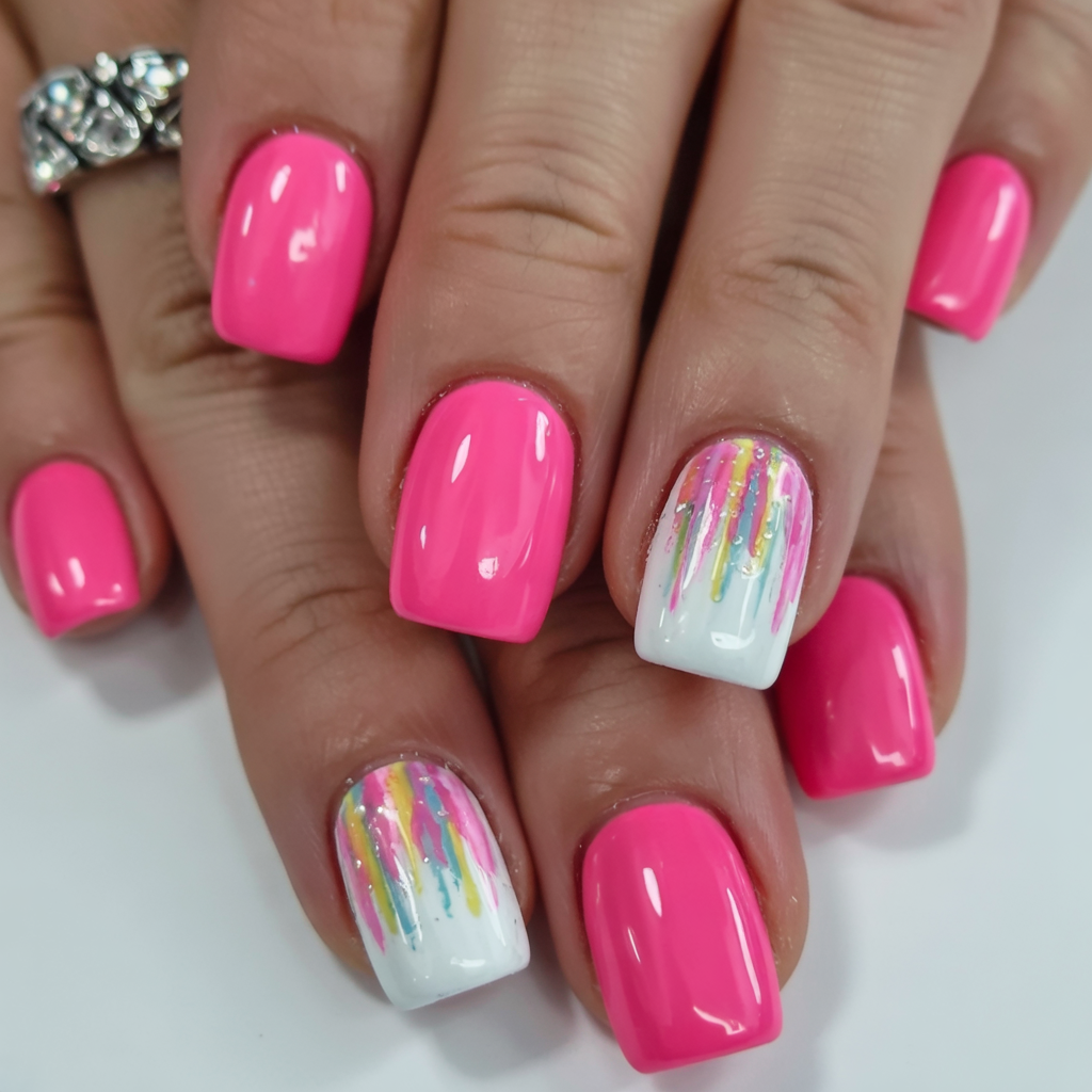 Bold pink takes center stage in this short glossy set, with two designs showcasing a creative drip effect over a white base. Each drip nail is a burst of colorful artistic design, featuring yellow, fuchsia and aqua shades, yet maintains an everyday accessibility. The outfit is perfect for festival style and rooftop evening elegance.