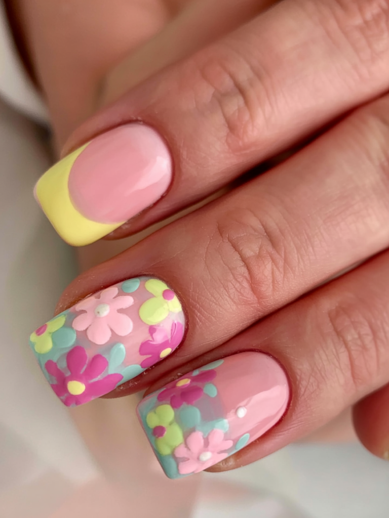 This set is an ultra feminine collection that resembles a blooming garden. Pink-coated square tips sit alongside three-dimensional floral art in mint, yellow and lavender pastel petals on the middle nails. The soft girl summer aesthetic is perfectly complemented by this special design.
