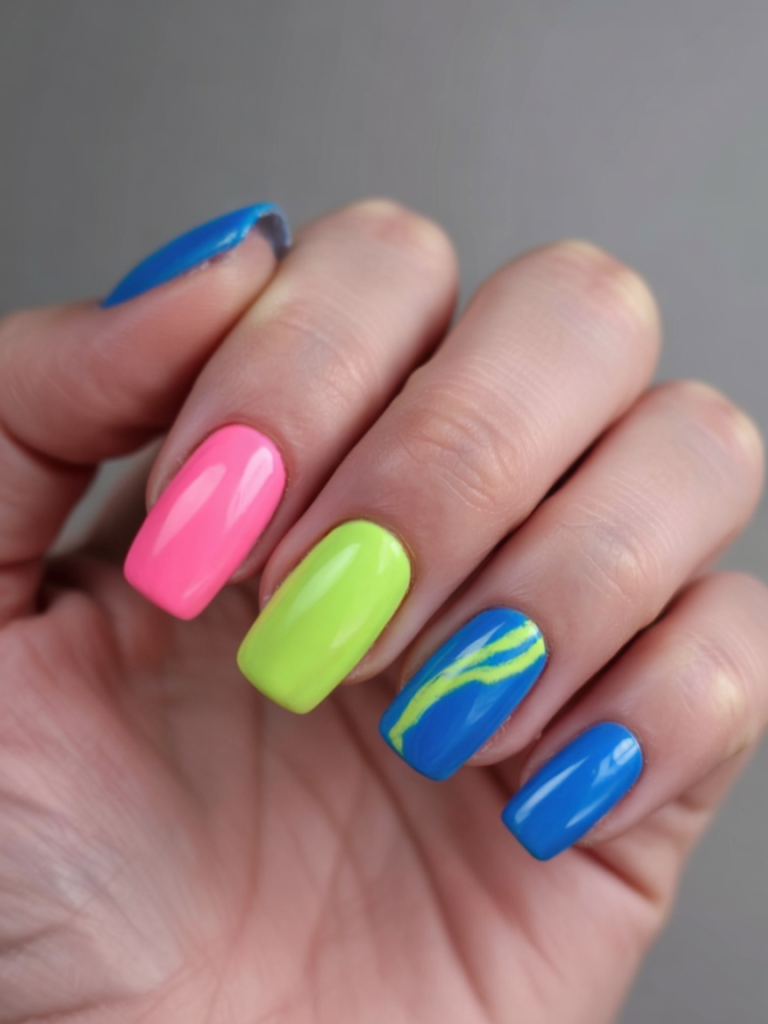 The colorful combination of 2025 shows both brightness and fun effect. A nail with wavy lines of blue, pink and neon green creates a playful color pattern that brings this design to perfection. A square nail shape creates clean lines that visually balance the bold colors. Ideal for bold personalities and maximalist dressers.