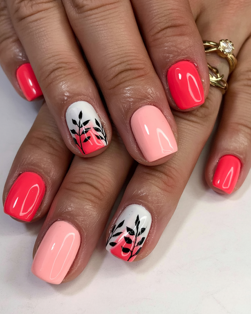 The wearable design combines blush and coral tones on clean nails, paired with softened ombre transitions at the edges and botanical drawings as tiny art details. Those seeking a simple yet pretty summer look with natural elements will find perfection in the rounded nail shape with its gentle profile.