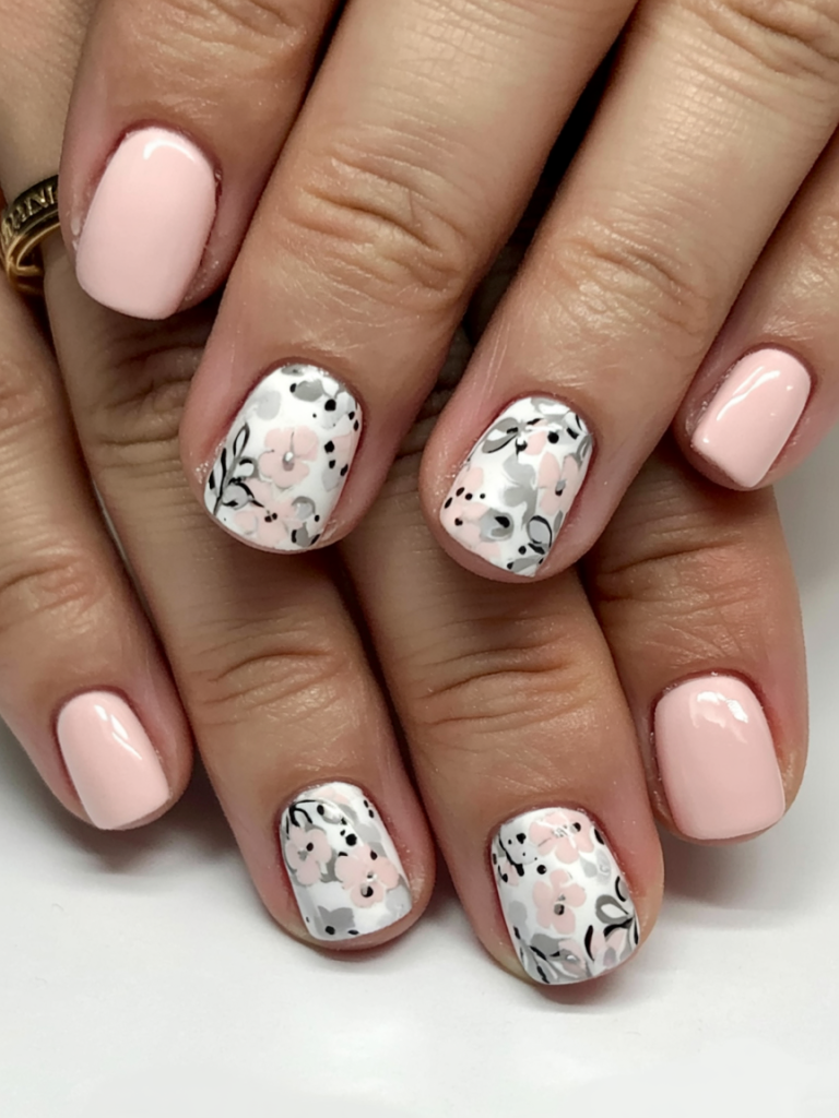 A simple blush pink manicure highlights short, rounded nails that are accented with matching garden-themed artwork using black, white and pink hand-painted designs. This romantic and sophisticated style is ideal for weddings and date nights, as well as pouring pink wine on a garden patio.