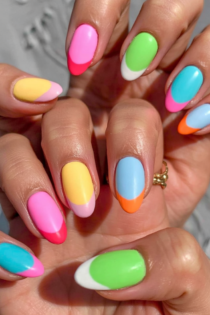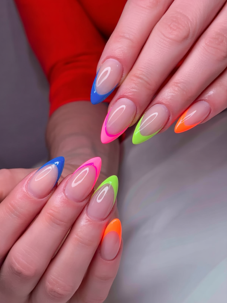 An almond-shaped design reinterprets the traditional French manicure by adding colorful elements. The pointed edges of each nail receive precise color application using dominant blues and pinks along with lime and orange. Different bold colors applied to the nail tips create a neat look that embodies the rainbow nail trend while maintaining an understated look. A favorite among influencers and stylists for its versatility.