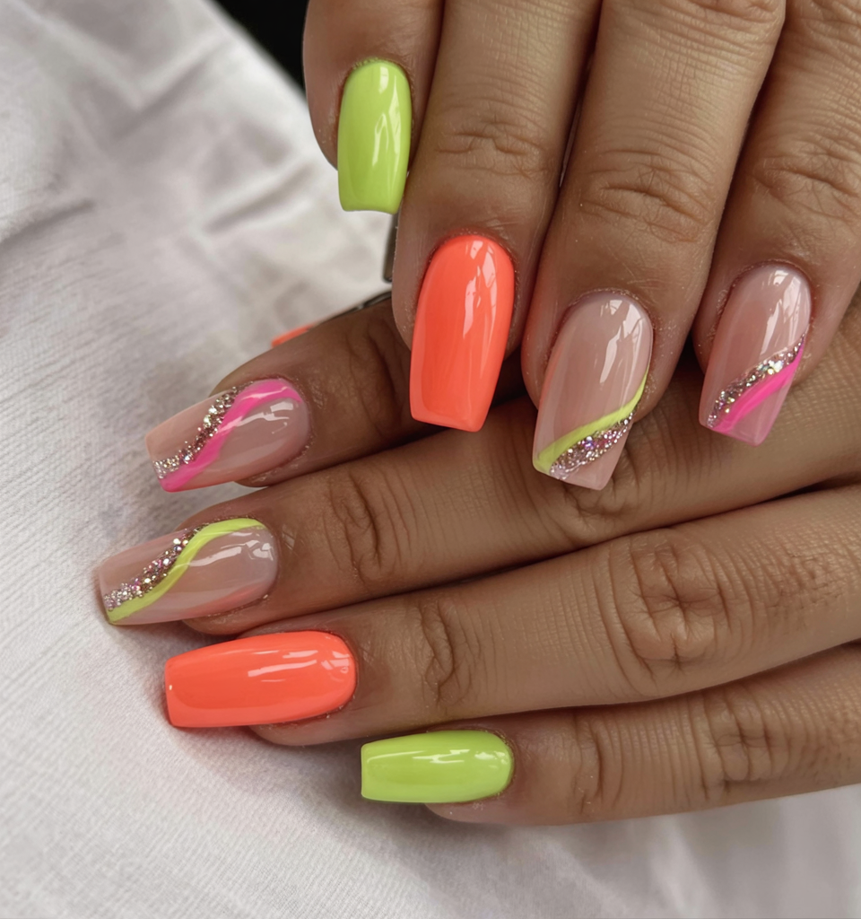 This retro and futuristic design features electric neon orange and green solid color tips. The wavy color pattern on the clear base creates a moving effect throughout the design, while glitter elements add dimension to the look. This style has a daring appeal with effortless wearability, making it suitable for anyone who wants to express their artistic style through bold fashion choices.
