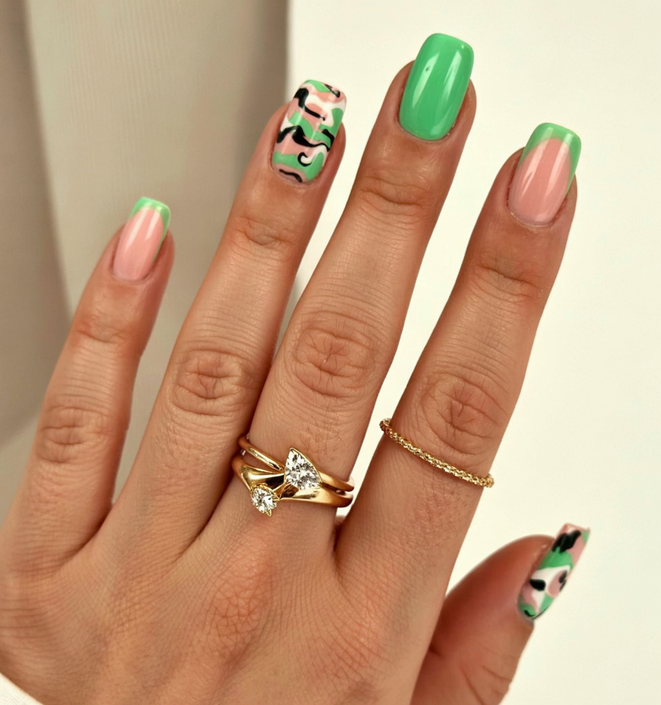 The fashion-forward will adore this design that incorporates all the style elements. The round tips use mint green solids along with whimsical animal-themed embellishments. Think runway meets safari chic. The combination of lustrous finishes and playful contrasts is as fresh as fashion editors like it to be, making it especially appealing for the upcoming summer 2025.