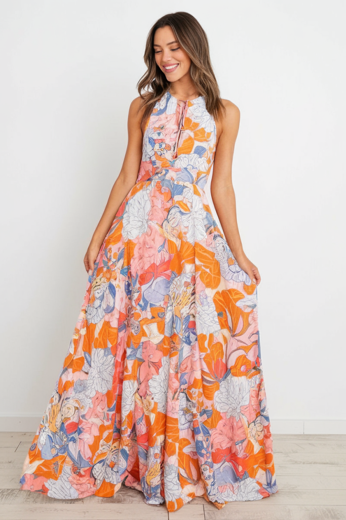 A flowy floral maxi dress stands out as the top contender in the cute summer fashion race. This merliah-inspired beaut flaunts a lively amalgamation of orange, pink, and blue flowers surrounded that practically personify the word effortlessly casual. The sleeveless, high-neck design of this dress is both timeless and chic, thus it is meant for such occasions as weddings, brunches, or even holiday getaways. Add a pair of simple gold jewelry and strappy sandals, and you would be able to get a beautiful feminine look.