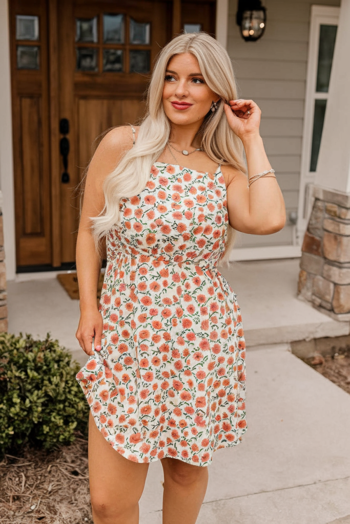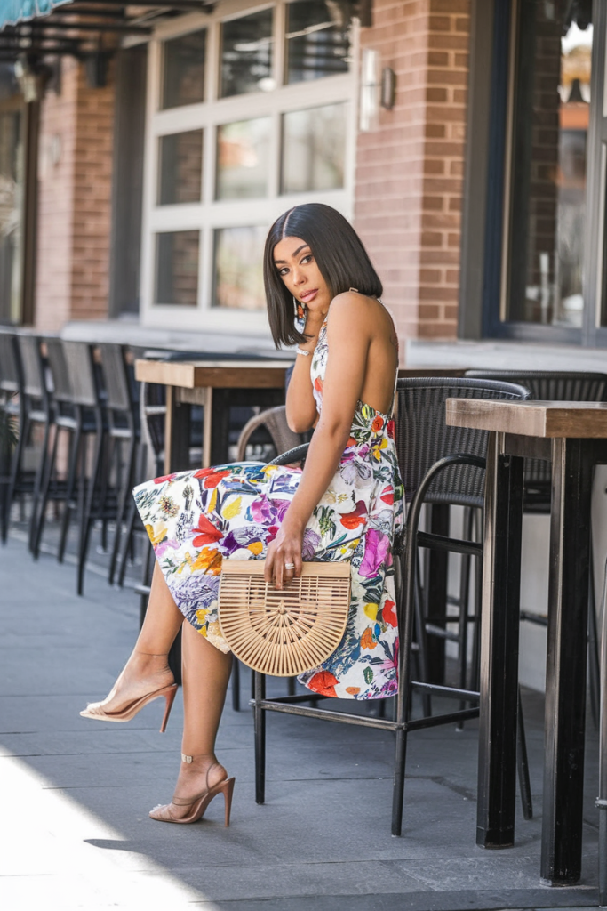 This beautiful flower-pattern sundress is a perfect example of how elegance and playfulness can be perfectly blended. The backless design gives a hint of the y2k era, yet it is still a fresh and contemporary addition. The look is accessorized with a prestigious structured rattan bag and a simple nude heel, making it a fashionable choice for a rooftop brunch or shopping in the city.