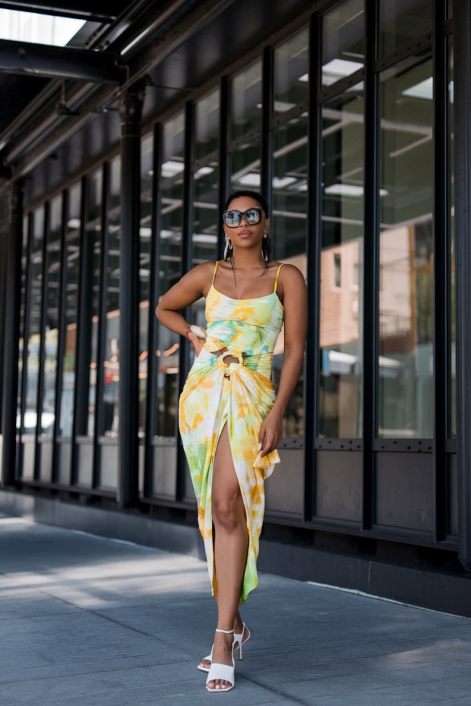 The tie-dye fashion is still going on in 2025, and the actual embodiment of the trend is this bright yellow and green cutout dress. This trendy summer accessory is made of ruched detailing and a side slit that flatters the figure, which is the best setting for this dress in the evening party or tropical vacation. White heels and statement sunglasses are the perfect accessories to complete the dress.