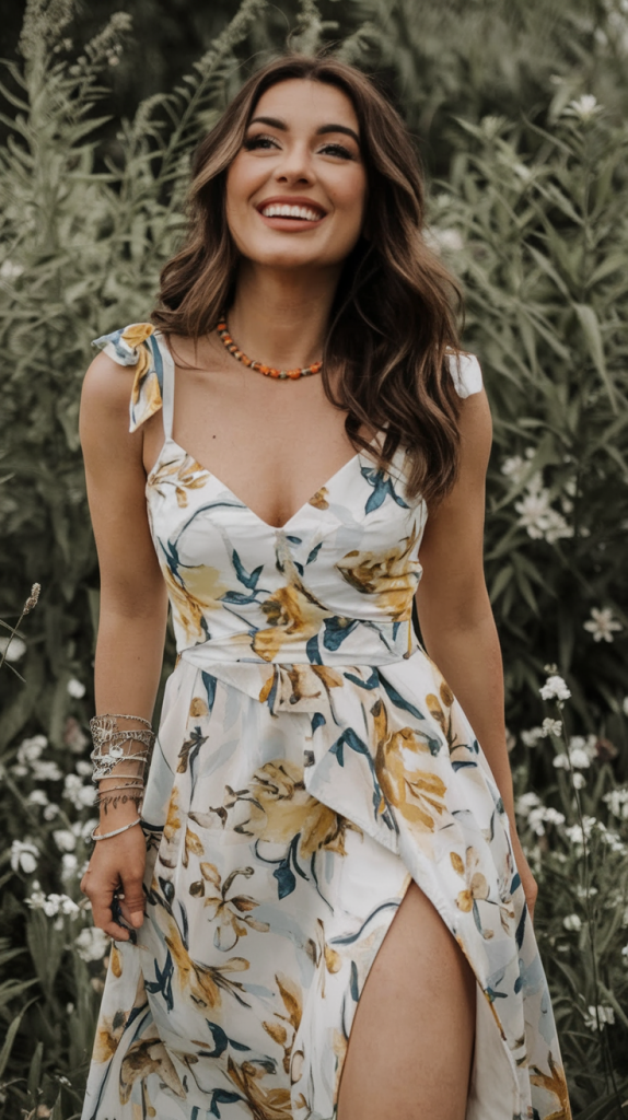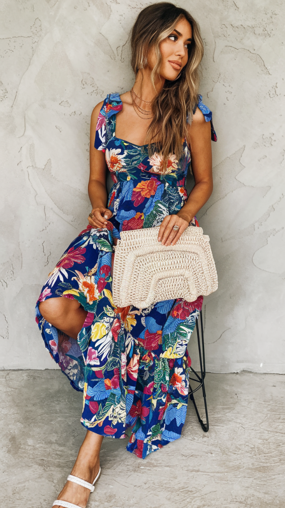 A vivid floral maxi dress with strong ruffled sleeves is the most eyecatching statement of the word VIP. The deep blue cloth, which is printed with various bright flowers, results in a style that is both majestic and fun. This dress, whether you wear it to a summer camp festival or a formal dinner, is a show-stealer. In addition, it would go absolutely terrific with a straw clutch and white sandals, which are perfect for a balanced yet on-trend look.