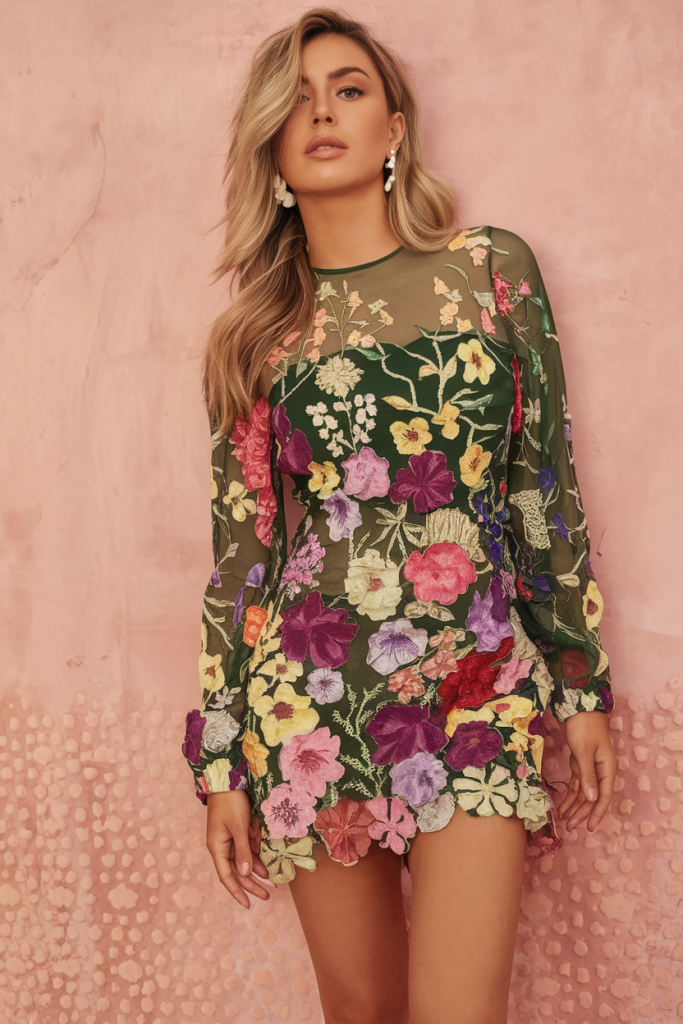 This dress, characterized by a brilliant design and exceptional craftsmanship, suggests sheer material games as the Christmas party or garden soirée showstopper. The base of dark green presents a rich tone, and the figurative flowers give a y2k style of animation to this dress without a vip logo. The long sleeves are a counterpoise to the sheer parts, giving a perfect combination of sexiness and elegance.