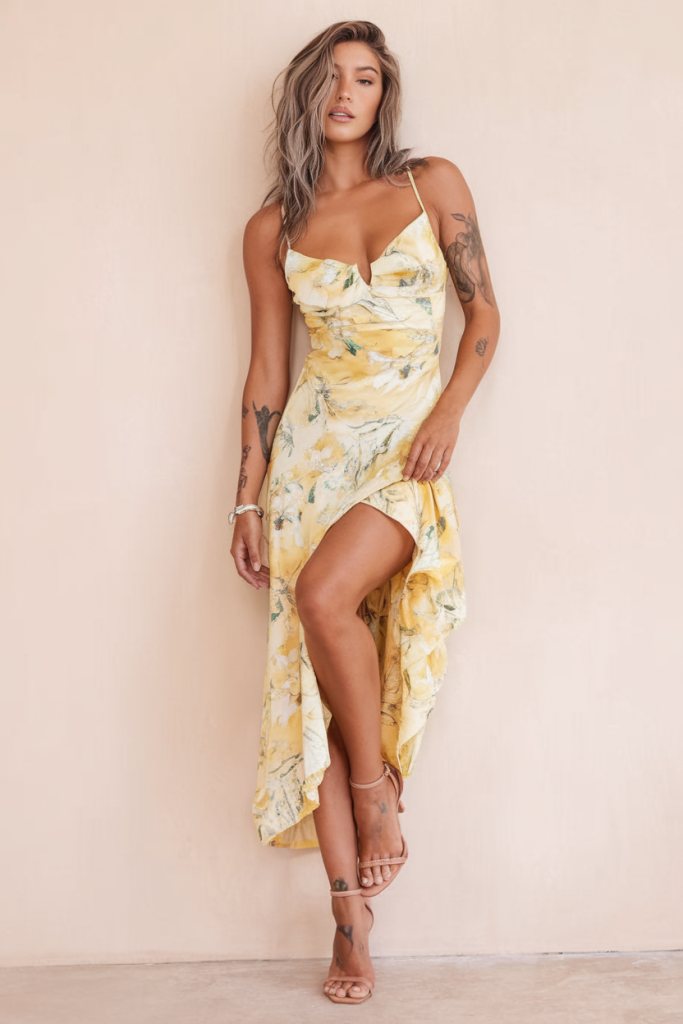This satin-like suit, which has a soft yellow color, is the epitome of elegance and self-confidence. The high-low hemline adds to the motion, and thus, it is an ideal choice for summer weddings or glamorous sunset gatherings. The soft bodice with a ruched effect not only makes it more appealing but also adds a romantic effect, whereas the flowing skirt is the symbol of simplicity.