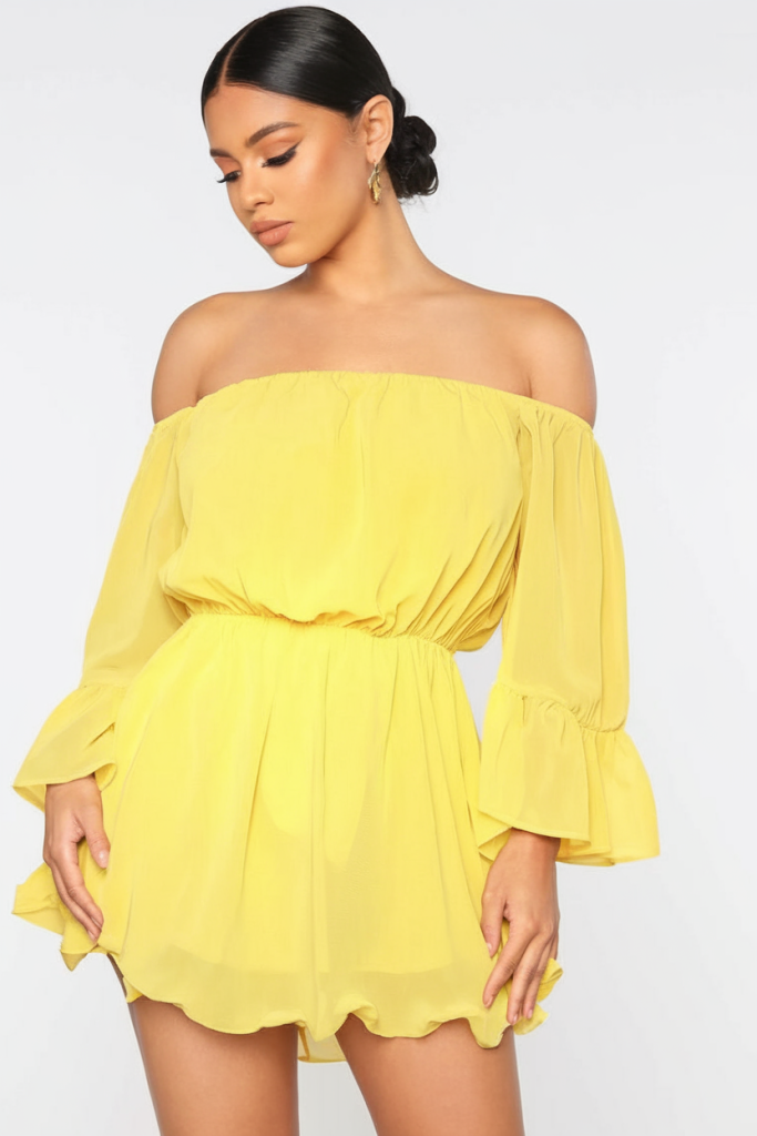 This adorable off-shoulder yellow dress with ruffle sleeves adds a cheerful vibe to a holiday wardrobe. The waistline and tulip bottom create a beautiful look of this dress, which makes it a quick choice for walks on the beach or a brunch with friends.