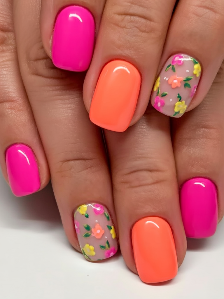 This design is the definition of summer cheer. The vibrant hot pink and neon coral polish scream fun in the sun, while the playful floral accents on the middle and ring nails bring balance and a handcrafted feel. Perfect for short, square nails, this look mixes glossy gel with soft, 3D floral art in yellow, orange, and fuchsia. Ideal for weekend getaways or tropical vacays, this acrylic set brings both energy and style.