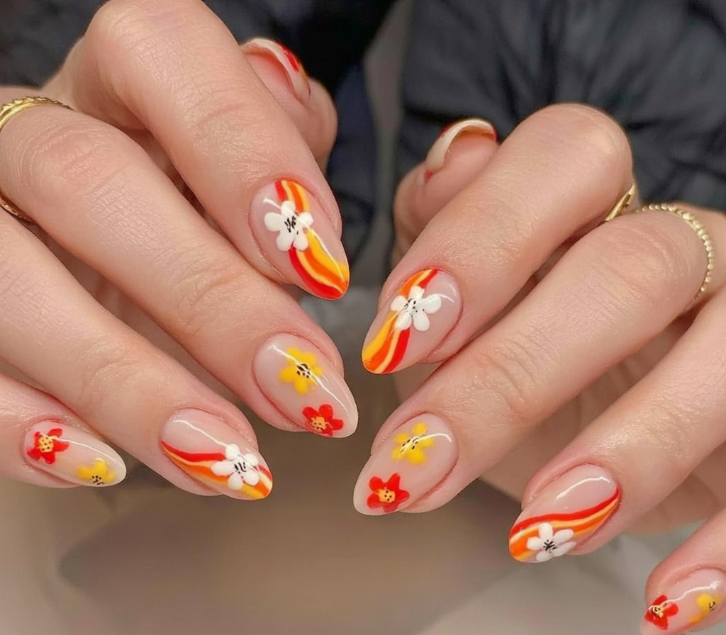Vibrant doesn’t even begin to describe this high-energy almond set. A medley of swirling sunset hues—red, orange, and yellow—forms the base for bold, simplified flower designs. The contrast of abstract color blocking and traditional petal shapes makes this one of the most stylish Designs 2025 looks on the list. It’s ideal for those craving something bright and modern with a touch of retro glam.