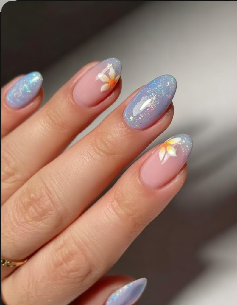 Dreamy and serene, this almond-shaped mani brings together shimmering holographic polish and delicate plumeria-style blossoms. The icy blue glitter catches the light like ocean waves, while the minimal floral elements keep things elegant and grounded. This is a simple yet enchanting design that’s perfect for anyone looking to capture beachy romance.