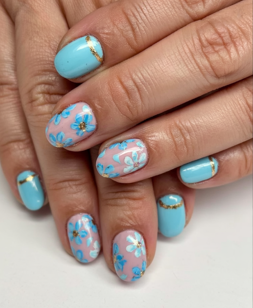 This charming short, square design is all about luxe detail. Powder blue polish alternates with pink-based nails covered in floral art, trimmed with tiny golden arcs. It’s a blend of whimsy and opulence that feels fit for a garden party or a casual outdoor wedding. Feminine yet fresh, this one’s for the fashionistas who appreciate subtle glam.