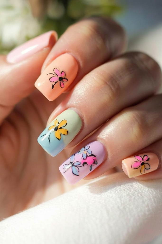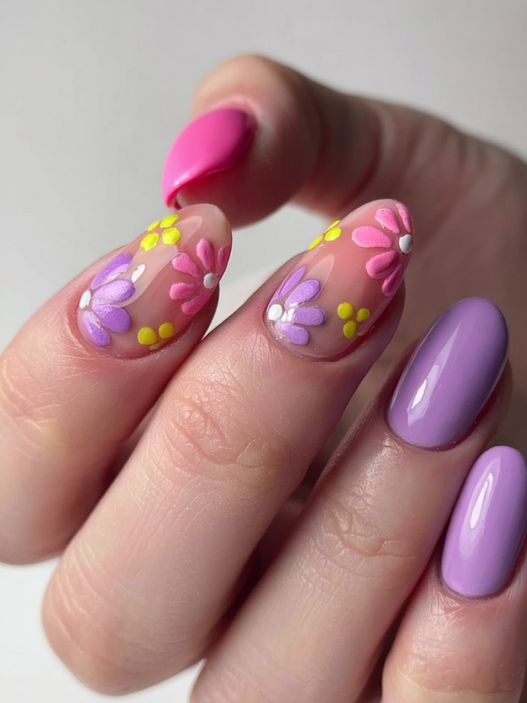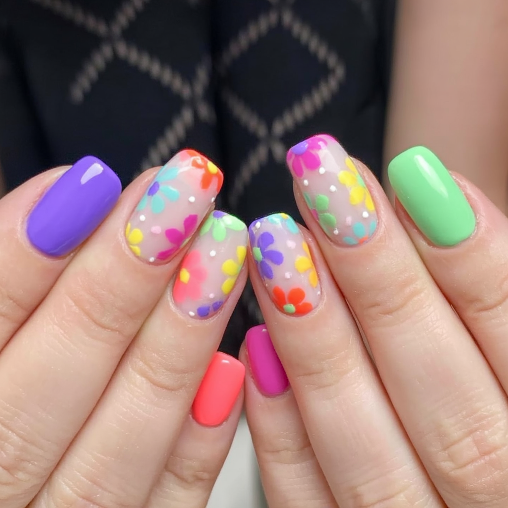 Talk about color explosion! These Designs floral nails mix a rainbow of petals across a neutral base with contrasting solid colors like lavender, red, mint, and pink. The placement of the flowers feels intentional and playful—an example of simple nail art that’s still high impact.